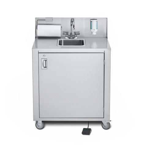 Portable Hand Sink, hot & cold water, (1) 12" wide x 14" front-to-back x 6" deep bowl, (2) 5 gallon removable fresh water tanks & (2) 7-1/2 gallon removable waste water tanks, soap & paper towel dispensers, electric water pump & hands-free foot pump opera