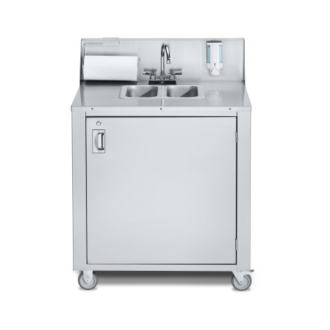 Portable Sink, cold water only, (2) 6" wide x 12" front-to-back x 5" deep bowls, (2) 5 gallon removable fresh water tanks & (2) 7-1/2 gallon removable waste water tanks, soap & paper towel dispensers, electric water pump & hands-free foot pump operation,