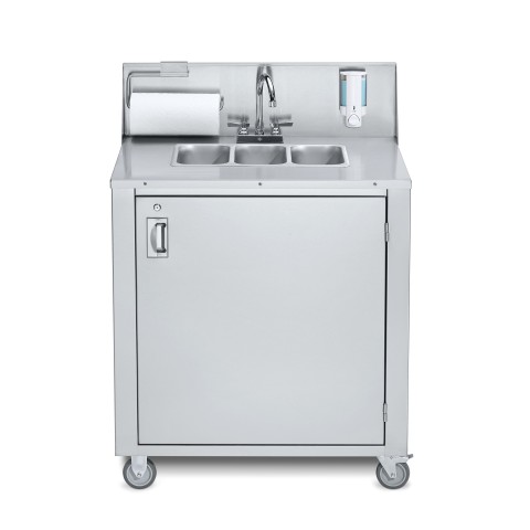Portable Sink, hot & cold water, (3) 6" wide x 12" front-to-back x 5" deep bowls, (2) 5 gallon removable fresh water tanks & (2) 7-1/2 gallon removable waste water tanks, soap & paper towel dispensers, electric water pump & hands-free foot pump operation,