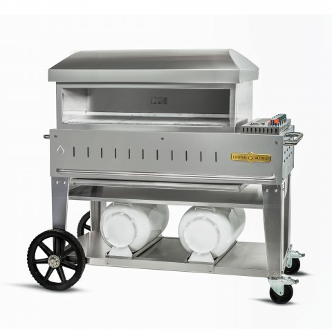Club Series Pizza Oven, LP gas, 36", 35-1/2" x 16" volcano stone cooking surface, (3) 10" pizza capacity, (3) burners, piezo ignition, includes (2) horizontally mounted 30 lb. propane tanks, push handles, 304 stainless steel construction, (2) 14" wheels &