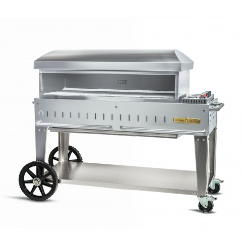 Mobile Series Pizza Oven, LP gas, 48", 47-1/2" x 16" volcano stone cooking surface, (4) 10" pizza capacity, (4) burners, piezo ignition, requires (2) vertically mounted 20 lb. propane tanks, push handles, 304 stainless steel construction, (2) 14" wheels &