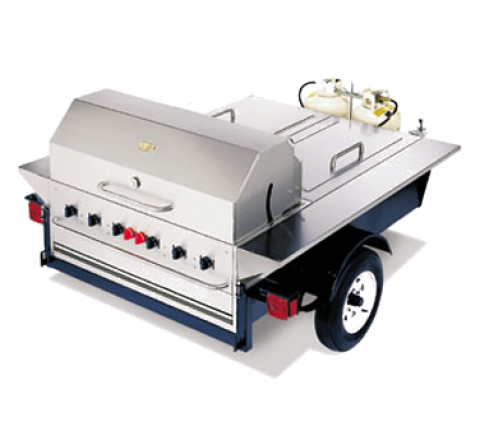 Towable Grill, 69" x 124" x 52" trailer, includes BI-48 grill & RD-48 roll dome lid, stainless steel cooking grates, side shelves, (2) insulated stainless steel beverage/meat storage compartments with drain, holds (2) propane tanks, 99,000 BTU, cETLus, ET