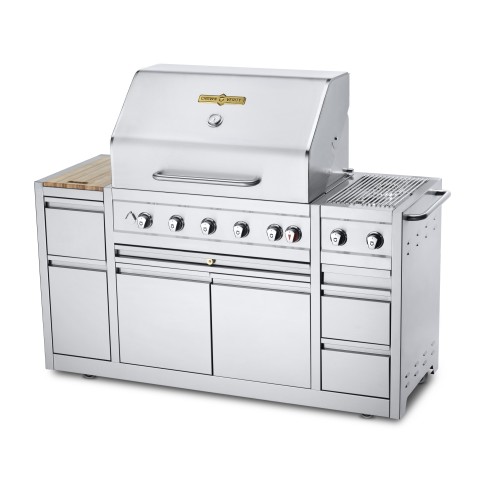 Crown Verity Estate Elite 36" Island Cart Grill, 34" x 21" grilling surface with (5) individually controlled burners, additional 15,000 BTU single side burner, adjustable bun rack, includes heavy duty cover, 94,500 total BTU