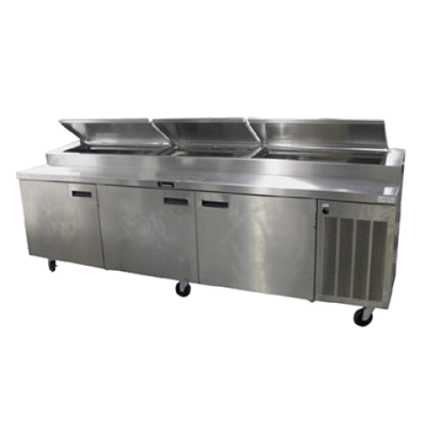 Refrigerated Pizza Table, three-section, 114", 30.9 cubic feet, (14) 1/3 pan capacity, (3) shelves, (3) 32" doors, 18 gauge stainless steel top, refrigerated pan rail, stainless steel ends, 6" casters, side-mounted refrigeration system, R290 Hydrocarbon refrigerant, (2) 1/5 HP, cUL, UL, NSF