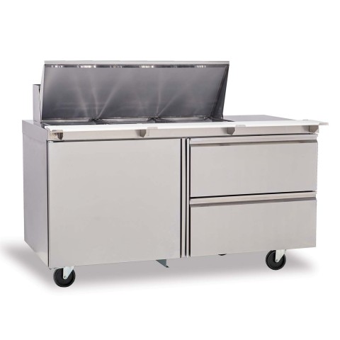 Mega Top Sandwich/Salad Refrigerator, two-section, 60" W, 20.20 cubic feet, (2) doors, (2) 1/1 GN shelves, stainless steel top with polyethylene cutting board & (18) 1/6 size plastic pans, ABS interior sides, stainless steel front & sides, 5" casters, front-breathing rear-mounted refrigeration system, R290 Hydrocarbon refrigerant, 0.35 hp, cUL, UL, NSF