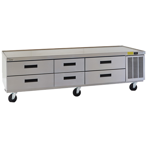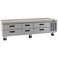 Refrigerated Low-Profile Equipment Stand, 96-1/4"W x 31-47/50"D x 24"H, three-section, (6) drawers (pans not included), marine edge stainless steel top & drawer fronts, front non-spill edge, ABS interior sides, 4" casters, side-mounted refrigeration system with electric condensate evaporator, R290 Hydrocarbon refrigerant, 1/4 hp, cUL, UL, NSF