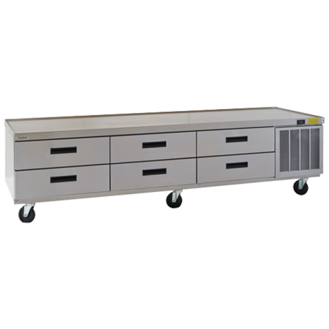 Refrigerated Low-Profile Equipment Stand, 99-1/4"W x 31-47/50"D x 24"H, three-section, (6) drawers (pans not included), stainless steel top & drawer fronts, front non-spill edge, ABS interior sides, 4" casters, side-mounted refrigeration system with electric condensate evaporator, R290 Hydrocarbon refrigerant, 1/4 hp, cUL, UL, NSF