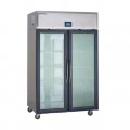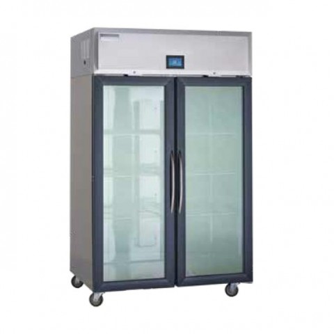 Specification Line® Refrigerator, Reach-In, Narrow, two-section, 46.0 cubic feet capacity, top-mounted self-contained refrigeration system, (4) half-height hinged glass doors (locking), (6) adjustable chrome wire shelves, 4.3" easyTouch® screen temperature display/control with remote monitoring, LED interior lighting, pilaster with shelf clips, stainless steel exterior front, sides & interior, (4) 5" locking casters, GreenGenius™ R290 Hydrocarbon refrigerant, 0.35 HP, 115v/60/1-ph, 6.0 amps, NEMA 5-15P, NSF, cULus, ENERGY STAR®