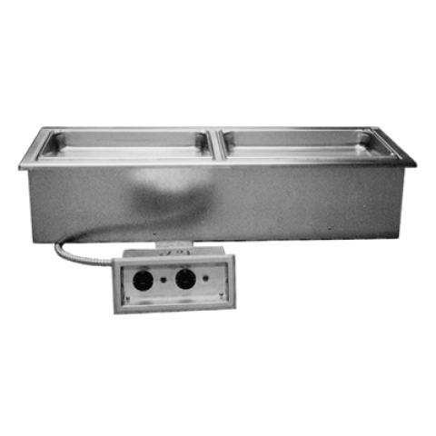 Narrow Drop-In Hot Food Well Unit, Electric, individual pan design, wet or dry type, 2-pan size for 12" x 20" pans, with drains, infinite controls, stainless steel top & inner liner, galvanized outer liner, 44-5/8" x 15" cutout required), cUL, UL, NSF