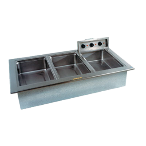 Narrow Drop-In Hot Food Well Unit, Electric, individual pan design, wet or dry type, 3-pan size for 12" x 20" pans, with drains, infinite controls, stainless steel top & inner liner, galvanized outer liner, (66-1/4" x 15" cutout required), cUL, UL, NSF