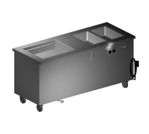 Shelleysteelâ„¢ Combination Hot/Cold Serving Counter, 74" long, (2) hot food wells, ice cooled 26" x 21.62" x 7" deep with 1" H stainless steel perforated false bottom, 14 gauge stainless steel top, stainless steel enclosed base, 5" swivel casters, 1/2" drain(s) for hot food wells plumbed to common valve, cUL, UL, NSF (contact factory for price)