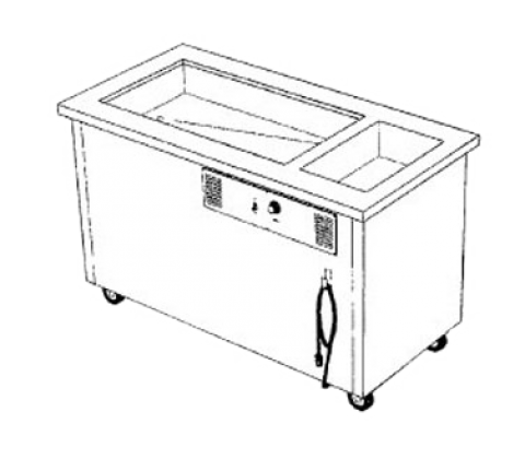 Shelleysteelâ„¢ Combination Hot/Cold Serving Counter, 50" long, (1) hot food wells, ice cooled 26" x 21.62" x 7" deep with 1" H stainless steel perforated false bottom, 14 gauge stainless steel top, stainless steel enclosed base, 5" swivel casters, 1/2" drain(s) for hot food wells plumbed to common valve, cUL, UL, NSF (contact factory for price)