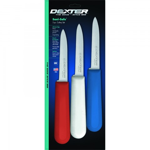 Sani-Safe® (S104-3RWC) Cook's Style Paring Knife, 3-1/4", stain-free, high-carbon steel, non-slip, textured, includes: (1) red, (1) white & (1) blue handle, NSF Certified, Made in USA (3 each per pack)