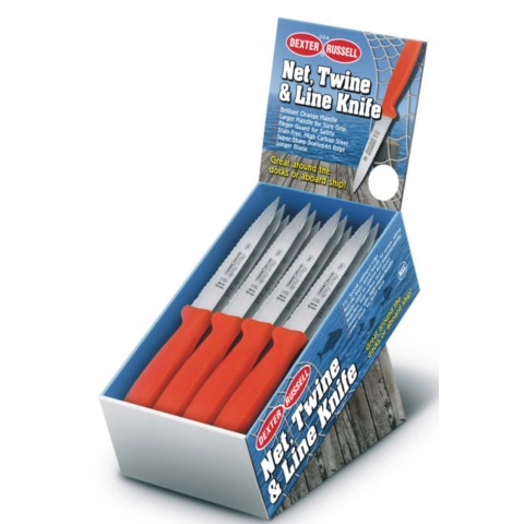 Sani-Safe® (NET105SC-36) Net/Twine/Line Knife Set, 3-1/2", scalloped edge, finger guard, high-carbon-steel blade, non-slip, orange, polypropylene handle, NSF Certified, display box of 36