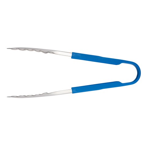 Utility Tongs, 9-1/2"L, one-piece, scalloped, heat resistant up to 500°F, dishwasher safe, stainless steel, blue silicone coated handle, NSF