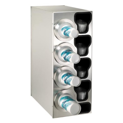 Cup Dispensing Cabinet, adjustable, (4) BFL-2F on left, holds 8 oz. to 44 oz. cups, rim dia. 3" - 4-1/2", stainless steel cabinet, 32-1/2"H x 13"W x 23"D, (4) E-Z slide slanted lid chutes & (1) straw organizers on right side, NSF cup dispensers