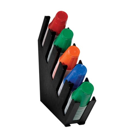 Cup and Lid Organizer, five sections, slim design, accommodates 6 oz. to 44 oz. paper, plastic or foam cups, rim diameter ranges from 2-5/8" to 4-3/4", 23" H x 5-1/4" W x 24-1/2" D, polystyrene, black, NSF