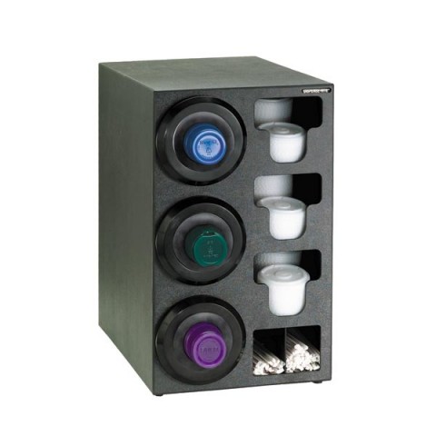 Cup Dispensing Cabinet, 24-1/4"H x 13"W x 23"D, interchangeable gasket, (3) SLR-2 on left, (3) angled lid compartments & (2) straw organizer on right, holds 8 to 44 oz. paper, plastic & foam cups, rim dia. 3"-4-1/2", black polystyrene construction, NSF cup dispensers