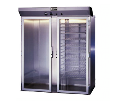 Proofer Cabinet, roll-in, two-section, capacity two (TLOI) double racks or four single racks, solid state heat/humidity controls, auto. water entry, full view glass doors, stainless steel interior and exterior