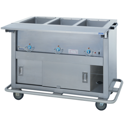Thurmaduke™ Steamtable, portable, 60"W x 25-1/2"D x 36"H, 16ga stainless steel top, (4) stainless steel sealed wells, drains, copper manifolds, (1) brass valve, thermostat, stainless steel cutting board, 20ga paint grip steel body, undershelf & doors, bumper, 5" dia. swivel casters, 6' cord & plug, cULus, UL EPH Classified NOTE: Electric values & plug configurations change for 3 phase or when adding electric options - Contact Factory for more info)