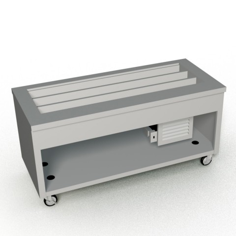Thurmaduke™ Cold Pan Unit, mobile, 74"W x 32"D x 36"H, tri-channel, accommodates (15) 1/3 pans, 8" deep, 63-7/8"W x 21-5/16"D stainless steel liner, stainless steel body & undershelf, 16ga stainless steel top, 5" swivel casters with brakes, self-contained refrigeration, R448a, 120v/60/1-ph, 0.4 HP, 8.0 amps, 6' cord, NEMA 5-15P, cULus, UL EPH Classified