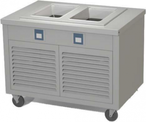 Thurmaduke™ HotColdFreeze Unit, mobile, 60"W x 32"D x 36"H, 16ga stainless steel top, (3) pan size, flush mount pans, individual digital touchscreen controls, individual drain per well, hinged stainless steel louvered grill, stainless steel body & undershelf, 5" dia. swivel casters with brakes, 10' cord & plug, UL EPH Classified