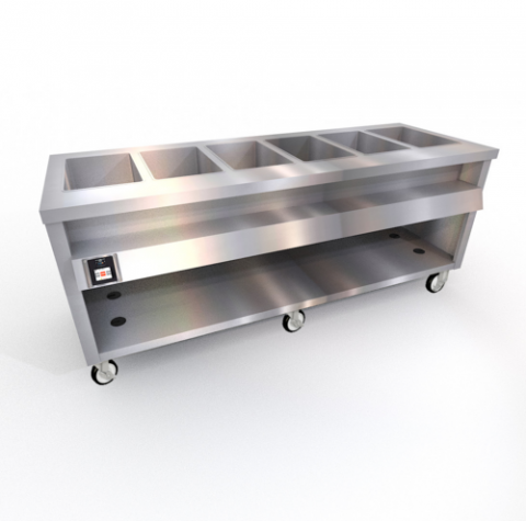 Thurmaduke™ Ganged Waterless Well, mobile, electric, 88"W x 32"D x 36"H, 16ga stainless steel top, (6) stainless steel heat wells, touch screen controls, stainless steel body & undershelf, dish shelf, 5" dia. swivel casters with brakes, 6' cord & plug, cULus, UL EPH Classified