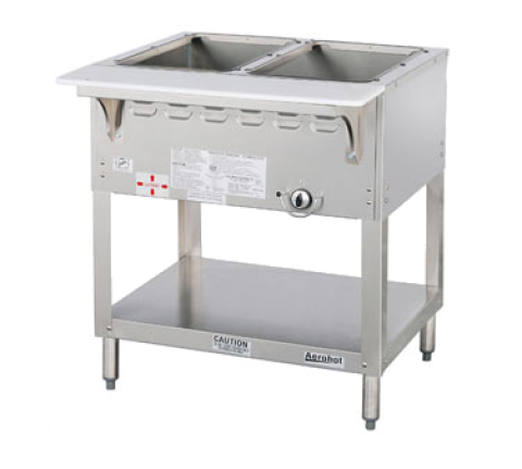 Aerohot Steamtable Wet Bath Unit, 30-3/8"W, gas, (2) pan size open water bath with (1) 15,000 BTU burner with adjustable gas valve control & safety pilot, stainless steel top with 1/2" thick x 7" wide poly carving board, 1" drain & valve, stainless steel open base with undershelf, legs & feet, CSA STAR, UL EPH Classified