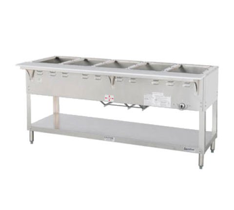 Aerohot Steamtable Wet Bath Unit, 72-3/8"W, gas, (5) pan size open water bath with (1) 27,000 BTU burner with adjustable gas valve control & safety pilot, stainless steel top with 1/2" thick x 7" wide poly carving board, 1" drain & valve, stainless steel open base with undershelf, legs & feet, CSA STAR, UL EPH Classified