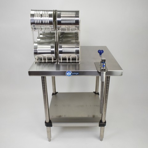 Can Opening Station, fixed, 24"W x 24"D x 32"H, S-11 can opener, (2) top-mounted can racks hold up to (8) cans each (16 total #10 cans), 500 lb. capacity lower shelf holds up to (6) cases of additional cans, fixed legs, stainless steel, Made in USA