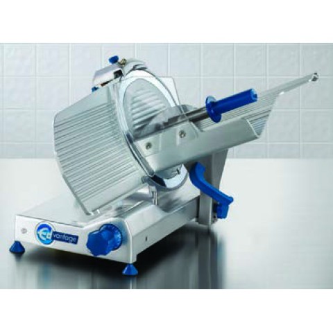 Edvantage™ Meat Slicer, electric, tabletop, 24-4/5"L x 25-1/5"W x 21-1/2"H, manual, gravity feed, belt driven, 12" dia. forged, hardened, carbon steel blade, removable carriage, safety interlock system, stainless steel pusher rod, blade guard safety micro switch, Tritan™ clear hand guard, dual ergonomic handles, blue indicator light, safety overload switch, sealed housing, built-in dual stone sharpener, removeable slice deflector, includes: blade removal tool, anodized cast aluminum & stainless steel construction, 115v/60/1-ph, 1/2HP, ETL Sanitation, cULus, UL EPH Classified