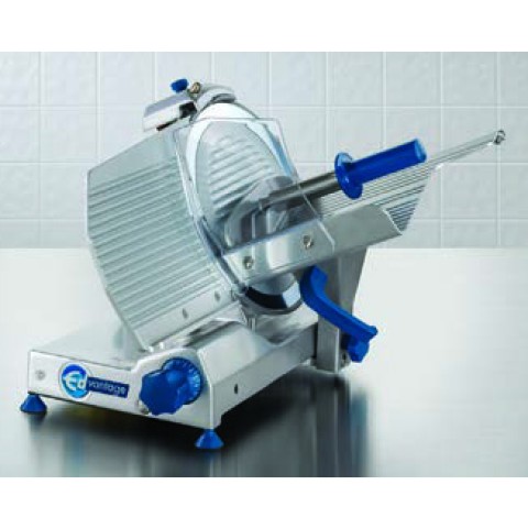 Edvantage™ Meat Slicer, electric, tabletop, 22-7/10"L x 23-1/5"W x 18-4/5"H, manual, gravity feed, belt driven, 12" dia. forged, hardened, carbon steel blade, removable carriage, safety interlock system, stainless steel pusher rod, blade guard safety micro switch, Tritan™ clear hand guard, dual ergonomic handles, blue indicator light, safety overload switch, sealed housing, built-in dual stone sharpener, removeable slice deflector, includes: blade removal tool, anodized cast aluminum & stainless steel construction, 115v/60/1-ph, 1/3HP, ETL Sanitation, cULus, UL EPH Classified