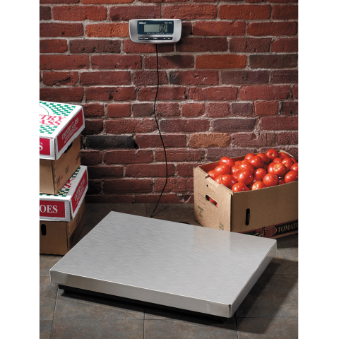 Scale, Digital Receiving, 300 lbs/150kg x .1lbs/ .05 kg. 25-1/2" x 20" stainless steel platform, LCD display, 4 load cell technology, 6 "AA" batteries, dual-voltage 12-volt power supply (included), wall mounting bracket (included), CSA, UL, CE, NSF