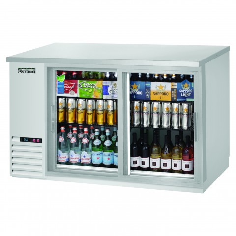Back Bar Refrigerator, two-section, 57-3/4"W, 17.0 cu. ft. capacity, (560) 12 oz. can or (357) 12 oz. bottle capacity, (2) glass sliding removable self-closing doors, snap-in magnetic door gasket, (4) epoxy coated adjustable wire shelves, digital controls with LED display, +33°F to +54°F temperature range, auto defrost, LED interior lighting with on/off switch, overheat protection alarm for compressor & condenser coil, stainless steel exterior & interior, self-contained side mounted refrigeration, R290 Hydrocarbon refrigerant, 1,557 BTU/hr, 1/4+ HP, 115v/60/1-ph, 3.5 amps, cord, NEMA 5-15P, NSF, cETLus, ETL-Sanitation