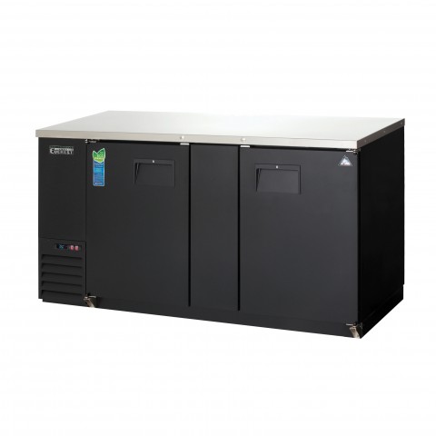 Back Bar Refrigerator, two-section, 68"W, 20.0 cu. ft. capacity, (700) 12 oz. can or (441) 12 oz. bottle capacity, self-contained side mounted refrigeration, stainless steel countertop, (2) solid hinged doors (locking), (4) epoxy coated wire shelves, digital controls with LED display, auto defrost, LED interior lighting with on/off switch, textured & laminated black vinyl exterior, galvanized steel interior wall & stainless steel floor, R290 Hydrocarbon refrigerant, 1/4 HP, 115v/60/1-ph, 3.5 amps, cord, NEMA 5-15P, NSF, cETLus, ETL-Sanitation