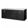 Back Bar Refrigerator, three-section, 89-1/4"W, 28.0 cu. ft. capacity, (980) 12 oz. can or (609) 12 oz. bottle capacity, self-contained side mounted refrigeration, stainless steel countertop, (3) solid hinged doors (locking), (6) epoxy coated wire shelves, digital controls with LED display, auto defrost, LED interior lighting with on/off switch, textured & laminated black vinyl exterior, galvanized steel interior wall & stainless steel floor, R290 Hydrocarbon refrigerant, 1/3 HP, 115v/60/1-ph, 2.5 amps, cord, NEMA 5-15P, NSF, cETLus, ETL-Sanitation
