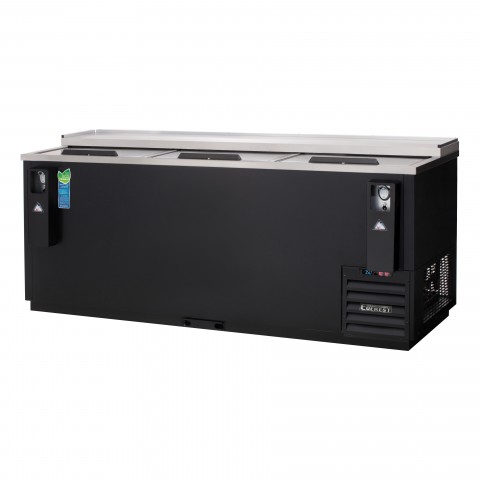 Horizontal Bottle Cooler, 80-1/2"W, 26.0 cu. ft. capacity, (1,008) 12 oz. can or (720) 12 oz. bottle capacity, self-contained side mounted refrigeration, stainless steel countertop, (3) stainless steel sliding lids (locking), (5) epoxy coated bin dividers, (3) epoxy coated wire shelves, (1) removable bottle cap opener & catcher, digital controls with LED display, auto defrost, LED interior lighting with on/off switch, textured & laminated black vinyl exterior, galvanized steel interior, R290 Hydrocarbon refrigerant, 1/3 HP, 115v/60/1-ph, 2.5 amps, cord, NEMA 5-15P, NSF, cETLus, ETL-Sanitation