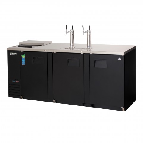 Club Top Direct Draw Keg Refrigerator, three-section, 89-1/4"W, 32.0 cu. ft. capacity, self-contained side mounted refrigeration, (3) solid hinged doors (locking), holds (4) 1/2 barrel kegs, (1) sliding club top lid, (1) epoxy coated wire shelf, (2) 3" diameter insulated stainless steel draft towers (NSF) with air distributor, (2) faucets per tower, stainless steel countertop & lid, digital controls with LED display, auto defrost, LED interior lighting, textured & laminated black vinyl exterior, galvanized steel interior wall & stainless steel floor, exterior drain port for excess top tray moisture, drain hose not included, floor drain required, R290 Hydrocarbon refrigerant, 1/3 HP, 115v/60/1-ph, 2.5 amps, cord, NEMA 5-15P, NSF, cETLus, ETL-Sanitation