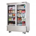 Reach-In Refrigerator, two-section, 54-1/8"W, 50.0 cu. ft. capacity, self-contained bottom mounted refrigeration, (2) full-height glass hinged self-closing field reversible doors (locking), (8) epoxy coated wire shelves, height adjustable clips, digital controls with LED display, auto defrost, LED interior lighting with on/off switch, stainless steel interior, stainless steel sides, galvanized steel top, bottom & rear, (2) leg stabilizers, (4) 5" swivel casters (2 locking), R290 Hydrocarbon refrigerant, 3/4 HP, 115v/60/1-ph, 7.0 amps, cord, NEMA 5-15P, NSF, cETLus, ETL-Sanitation