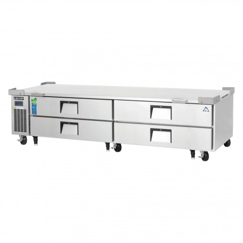 Chef Base Refrigerator, two-section, 95-1/2"W, self-contained side mounted refrigeration, (4) heavy duty stainless steel drawers, 1,434 lbs. weight capacity, 16 gauge stainless steel worktop, digital controls with LED display, auto defrost, dual air chamber & vents, high heat insulation, stainless steel grips, worktop security corner guards, stainless steel interior & exterior, galvanized steel bottom & rear, (3) leg stabilizers, (6) 5" swivel casters (3 locking), R290 Hydrocarbon refrigerant, 1/3 HP, 115v/60/1-ph, 2.0 amps, cord, NEMA 5-15P, NSF, cETLus, ETL-Sanitation