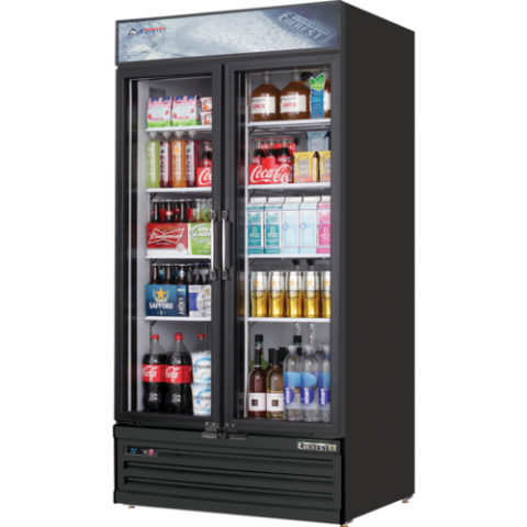 Reach-In Glass Door Merchandiser Refrigerator, two-section, 39-3/8"W, 36.0 cu. ft. capacity, (336) 20 oz. bottle capacity, self-contained bottom mounted refrigeration, (2) glass hinged self-closing doors, (8) epoxy coated wire shelves, height adjustable clips, digital controls with LED display, auto defrost, LED interior lighting with on/off switch, double-pane glass, white coated steel interior, black coated steel exterior, stainless steel floor, (4) adjustable screw legs, R290 Hydrocarbon refrigerant, 1/3 HP, 115v/60/1-ph, 2.5 amps, cord, NEMA 5-15P, NSF, cETLus, ETL-Sanitation
