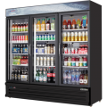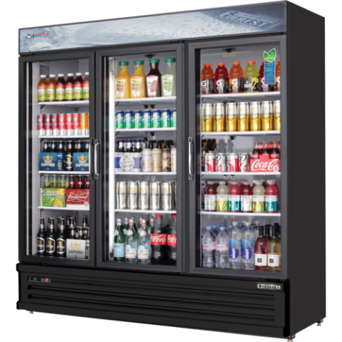 Reach-In Glass Door Merchandiser Refrigerator, three-section, 72-7/8"W, 71.0 cu. ft. capacity, (672) 20 oz. bottle capacity, self-contained bottom mounted refrigeration, (3) glass hinged self-closing doors, (12) epoxy coated wire shelves, height adjustable clips, digital controls with LED display, auto defrost, LED interior lighting with on/off switch, double-pane glass, white coated steel interior, black coated steel exterior, stainless steel floor, (6) adjustable screw legs, R290 Hydrocarbon refrigerant, 3/4 HP, 115v/60/1-ph, 7.0 amps, cord, NEMA 5-15P, NSF, cETLus, ETL-Sanitation
