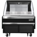 Horizontal Open Display Merchandiser, 37-1/4"W x 34-1/4"D x 41"H, 5.6 cu. ft. capacity, self-contained bottom mount refrigeration, front air intake & rear air discharge, LED lighting in canopy & underneath shelves, retractable night curtain, 2-tier stainless steel shelf riser, overheat protection alarm, stainless steel interior, black exterior, 5" front swivel casters with locks & leg stabilizers, R290 Hydrocarbon refrigerant, 1/2 HP, 115v/60/1-ph, 7.0 amps, cord, NEMA 5-20P, ETL-Sanitation, cETLus, NSF