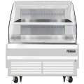 Horizontal Open Display Merchandiser, 48"W x 34-1/4"D x 46"H, 9.7 cu. ft. capacity, self-contained bottom mount refrigeration, front air intake & rear air discharge, LED lighting in canopy & underneath shelves, retractable night curtain, (1) adjustable stainless steel shelf, overheat protection alarm, stainless steel interior, white exterior, 5" front swivel casters with locks & leg stabilizers, R290 Hydrocarbon refrigerant, (2) 1/2 HP, 115v/60/1-ph, 10.6 amps, cord, NEMA 5-20P, ETL-Sanitation, cETLus, NSF