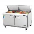 Sandwich Prep Table, Mega-Top, two-section, 59-1/8"W, 16.0 cu. ft. capacity, self-contained rear mounted refrigeration, stainless steel top with opening for (24) 1/6 size pans, (1) 1/2" thick insulated top lid, removable 9-1/8" deep cutting board, (2) solid hinged self-closing doors, (2) epoxy coated wire shelves, height adjustable clips, digital controls with LED display, auto defrost, front air breathing, stainless steel interior, stainless steel top, bottom & sides, galvanized steel bottom & rear, (4) 5" swivel casters (2 locking), R290 Hydrocarbon refrigerant, 1/3 HP, 115v/60/1, 2.5 amps, cord, NEMA 5-15P, NSF, cETLus, ETL-Sanitation
