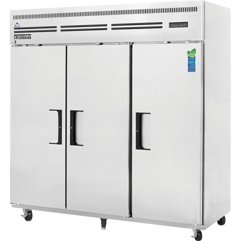 Reach-In Freezer, three-section, 74-3/4"W, 71.0 cu. ft. capacity, self-contained top mounted refrigeration, (3) solid hinged self-closing field reversible doors (locking), (9) epoxy coated wire shelves, height adjustable clips, digital controls with LED display, auto defrost, LED interior lighting, stainless steel interior, stainless steel front & sides, galvanized steel top, bottom & rear, (1) leg stabilizer, (4) 5" swivel casters (2 locking), (2) 3/4 HP, 115v/60/1-ph, 12.0 amps, cord, NEMA 5-20P, NSF, cETLus, ETL-Sanitation