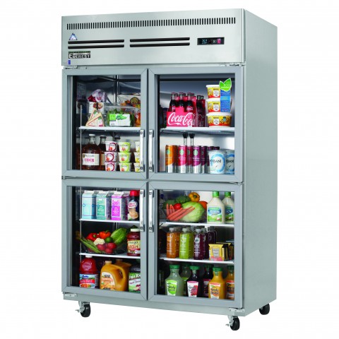 Reach-In Refrigerator, two-section, 49-5/8"W, 48.0 cu. ft. capacity, (4) double-paned glass hinged self-closing half doors, snap-in magnetic door gasket, (8) epoxy coated adjustable wire shelves, digital controls with LED display, +33°F to +54°F temperature range, auto defrost, LED interior lighting with on/off switch, pressure relief port, overheat protection alarm for compressor & condenser coil, stainless steel interior, stainless steel sides, galvanized steel top, bottom & rear, (2) leg stabilizers, (4) 5" swivel casters (2 locking), self-contained top mounted refrigeration, R290 Hydrocarbon refrigerant, 1/3 HP, 115v/60/1-ph, 3.0 amps, cord, NEMA 5-15P, NSF, cETLus, ETL-Sanitation