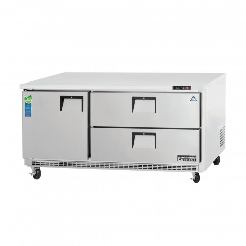 Drawered Undercounter/Worktop Refrigerator, two-section, 71-1/8"W, 22.0 cu. ft. capacity, self-contained rear mounted refrigeration, 16 gauge stainless steel worktop, (1) solid hinged self-closing door (locking), (2) heavy duty drawers, (2) epoxy coated wire shelves, height adjustable clips, digital controls with LED display, auto defrost, front air breathing, pressure relief port, stainless steel interior, stainless steel front & sides, galvanized steel bottom & rear, (4) 5" swivel casters (2 locking), R290 Hydrocarbon refrigerant, 1/3 HP, 115v/60/1-ph, 3.7 amps, cord, NEMA 5-15P, NSF, cETLus, ETL-Sanitation (drawer pans not included)