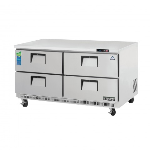 Drawered Undercounter/Worktop Refrigerator, two-section, 59-1/4"W, 18.0 cu. ft. capacity, self-contained rear mounted refrigeration, 16 gauge stainless steel worktop, (4) heavy duty drawers, digital controls with LED display, auto defrost, front air breathing, pressure relief port, stainless steel interior, stainless steel front & sides, galvanized steel bottom & rear, (4) 5" swivel casters (2 locking), R290 Hydrocarbon refrigerant, 1/4 HP, 115v/60/1-ph, 3.5 amps, cord, NEMA 5-15P, NSF, cETLus, ETL-Sanitation (drawer pans not included)