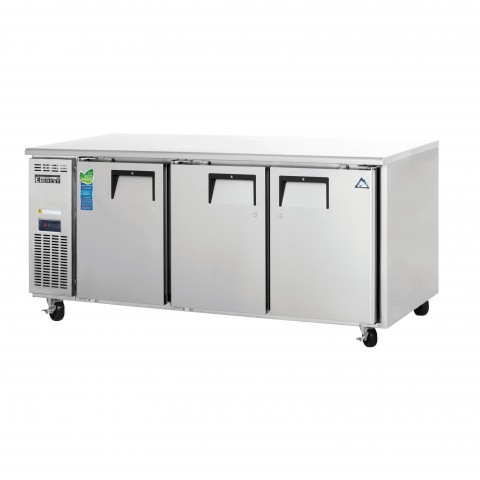 Undercounter/Worktop Refrigerator, three-section, 71-1/8"W, 22.0 cu. ft. capacity, self-contained side mounted refrigeration, 16 gauge stainless steel worktop, (3) solid hinged self-closing doors (locking), (6) epoxy coated wire shelves, height adjustable clips, digital controls with LED display, auto defrost, LED interior lighting, pressure relief port, stainless steel interior, stainless steel front & sides, galvanized steel bottom & rear, (4) 5" swivel casters (2 locking), R290 Hydrocarbon refrigerant, 1/4 HP, 115v/60/1-ph, 3.9 amps, cord, NEMA 5-15P, NSF, cETLus, ETL-Sanitation